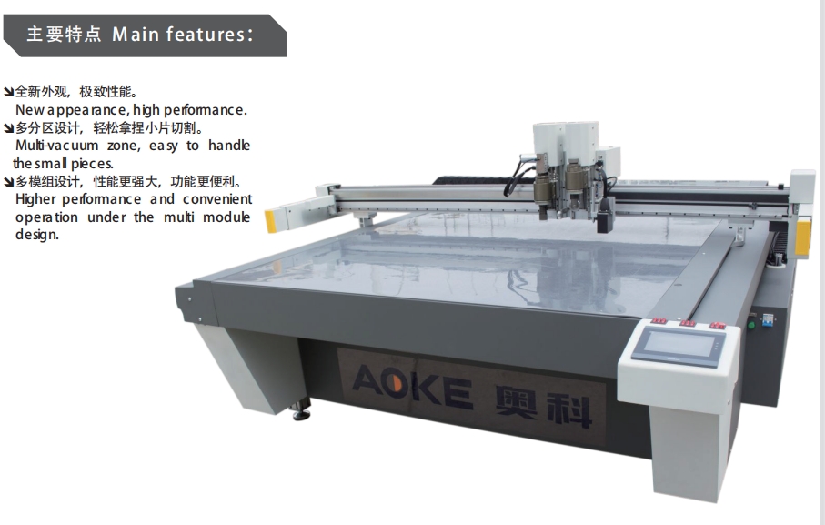 The AKZ20 series flatbed cutting & prototyping machine is newly developed by AOKE for packaging, printing, advertising and display industries. Adopting two independent modular tool heads with excellent expandability, it realizes truly interchangeable cutters. Supplied with oscillating knife, pen, creasing wheel, drag knife, foam knife, V-groove knife, etc., it cuts up to 60 mm thick and handles corrugate, honeycomb board, cardboard, foam, greyboard, photo paper, banner fabric, canvas, KT board, PVC foam board, etc. The brand-new platform replaces the original aluminum profile with a steel frame and re-engineers the multi-zone vacuum table for stronger suction and rock-solid mechanical stability. Depending on material and application, it is also called carton plotter, sample maker, cutting table, advertising cutter, display stand cutter, foam cutter, intelligent cutting-prototyping system, etc. Suitable for cutting, prototyping and short-run production in packaging, color printing, advertising and display sectors.