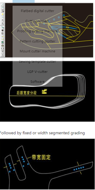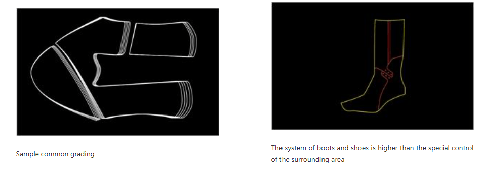 footwear design and grading software is used for shoes manufacturing. With the scanner or digitizer, a pattern or a hemihedral board can be inputted. The equipment can automatically add side from the hemihedral board. Folding sides accurately control the distance pressing side Different distance between two lines is shard single side-control of symmetric internal and external waist, thus making the grade more accurate.